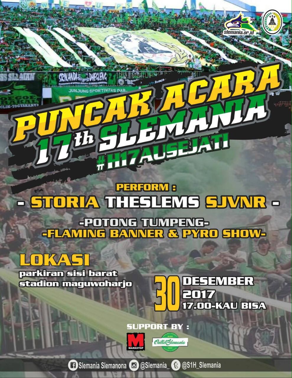 Slemania.or.id - Slemania yang genap berusia 17 tahun pada 22 desember 2017 kemarin akan mengadakan acara peringatan hari ulangtahun slemania dengan rangkaian acara yang bertajuk #H17AUSEJATI